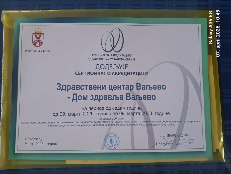 Д ому здравља Ваљево је у уторак 7. априла 2026.. године, на Светски дан здравља, Агенција за акредитацију здравствених установа (АЗУС), свечано уручила сертификат о стеченој акредитацији на седам година. Сертификат је на колегијуму уручила, испред АЗУС-а, виши стручни сарадник Светлана Дрча која је учествовала у припреми и едукацији у поступку акредитације Дома здравља Ваљево.